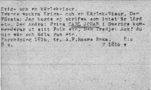 //// Krig- och en kärlekvi ser. //// Ttfe^ne vackra Krigs- coh en Kärlek-"'iaor. 'Ben Första; Jag borde ej skrlfwa eo» intet Sr lErd etc, De*- Andra: Prins CÅ3L JCRaR i Sverige kommenderar ut sitt Folk eWTrn^Tredje; £Ck« du min trän och ädla ro* ét<* . //// Forrköping 1816, tr. A.F.Kanirs Inka. P:o B 9. .1? 1816 e ////