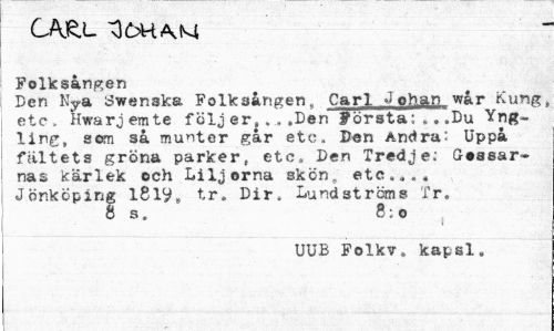 //// CA£L t)öH>\M //// Folksången //// Den Kya Swenska Folksången, Car). Johan wår Kung, etc „ Hwarj em te följ er, .Den första; ...Du Yngling, som så munter går etc» Den Andra: Uppå faltets gröna parker, etc. Den Tredje: Gossarnas kärlek och Liljorna skön, etc... Jönköping 1819, tr. Dir. Lundströms Tr. 8 s. 8;o //// UUE Folkv» kapsi. ////