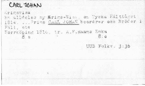 //// CftfcLiöflMO //// j\rigsvisa //// i". all«1ele3 ny Krigs-vVi v- om ?yska ttåget iSl4. ,..Prins .IQHa*! beordrar oss Bröder i //// | Falt, et® Norrköping l8lG, tr. A.F.Haama Enka 8 s 8.0 //// UUB Folk v. 3:36 //// 1 ////