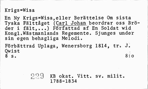 //// Krigs=Wisor //// En Ny Krigs=Wisa,eller Berättelse Om sista Tyska Fälttåget (Carl Johan beordrar oss Bröder i fält,...) Författad af En Soldat wid Kongl.Wästmanlands Regemente. Sjunges under sin egen behagliga Melodi. //// Förbättrad Uplaga, Wenersborg 1814, tr. J. Qwist //// 8 s. 8:0 //// 04n KB okat. Vitt. sv. milit. //// 'C 1 U 1788-1834 ////