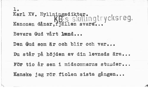 //// i;rl xv. f trycksreg. //// Kanonen dånar.fjällen svara... //// Bevara Gud vårt Isand... //// Den Gud som är och blir och var... //// Du står på höjden av din levnads ära... //// För tio år sen i midsommarns stunder... //// Kanske jag rör fiolen sista gången... //// 1 \ ////