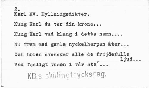 //// s. //// Karl XV. Hyllningsdikter. //// Kung Karl du tar din krona... //// Kung Karl vad klang i detta namn... //// Nu fram med gamla nyckelharpan åter... //// Och hören svenskar alle de fröjdefulla //// ljud... //// Yad fasligt väsen i vår sta'... //// KB:s skiUingtrycksreg- ////