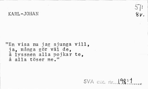//// 61- //// KARL-JOHAN //// "En visa nu jag sjunga vill, ja, många gör väl de, å lyssnen alla pojkar te, å alla töser me." //// SVA ccc. rir. mil... ////