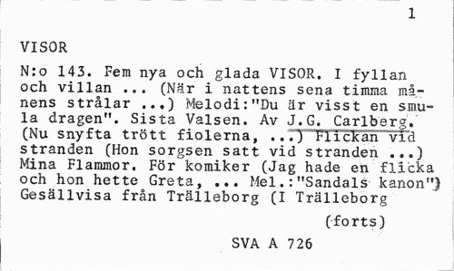 //// 1 //// VISOR //// N:o 143. Fem nya och glada VISOR. I fyllan och villan ... (När i nattens sena timma månens strålar ...) Melodi:"Du är visst en smula dragen". Sista Valsen. Av J.G. Carlberg. (Nu snyfta trött fiolerna, . .7) Flickan vTd stranden (Hon sorgsen satt vid stranden ...) Mina Flammor. För komiker (Jag hade en flicka och hon hette Greta, ... Mel.:"Sandals kanon"} Gesällvisa från Trälleborg (I Trälleborg //// (forts) //// SVA A 726 ////