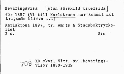 //// Beväringsvisa [^utan särskild titelsidaj //// för 189 7 (Vi till Karlskrona har kommit att krigsmän blifva ...) //// Karlskrona 1897, tr. Am:ts & Stadsboktryckeriet //// 2 s. 8:o //// ~nQ KB okat. Vitt. sv. bevärings- //// /UcJ visor 1880-1939 ////