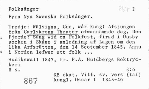 //// Folksånger 2 //// Fyra Nya Swenska Folksånger. //// Tredje: Wälsigna, Gud, wår Kung! Afsjungen från Carlskrona Theater ofwannamn.de dag. Den . Fjerdef Sång wid en Folkfest, firad i Ousby socken i Skåne i anledning af Lagen om den lika Arfsrätten, den 14 Seotember 1845. Innu • i Norden lefwer ett folk ... //// Hudikswall 1847, tr, P.A. Huldbergs Boktryckeri //// 8 s. 8:o //// KB okat. Vitt. sv. vers (tal) kungl. Oscar I 1845-46 ////