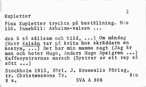 //// 2 //// Kupletter //// Fina Kupletter tryckta på beställning. N:o 150. Innehåll: Arholma-valsen ... //// den ä så sällsam och blid, ...) Om måndag (Herr Kalsån tar på krita hos skräddarn en kostym, ...) Det har min mamma sagt (Jag är i man och heter Hugo, Anders Hugo Apelgren Kaffesystrarnas marsch (Systrar av ett rep så sött ...) //// Stockholm 1915, förl. J. Kronwalls Förlag, tr. Christenssons Tr. 8:o //// 8 s. SVA A 808 ////
