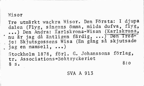 //// Wisor //// Tre utmärkt x^ackra Wisor. Den Första: I djupa dalen (Flyg, sångens ömma, milda dufva, flyg, Den Andra: Xarlskrona-Wisan (Karlskrona, nu är jag då äntligen färdig, ...) Den Tred-" je: Skjutsgossens Wisa (En gång så skjutsade , jag en mamsell, ...) //// Stockholm 1878, förl. G. Johanssons förlag, tr. Associations=Boktryckeriet 8 s. 8:0 //// SVA A 913 ////