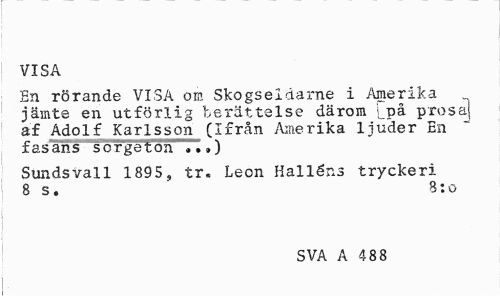 //// VISA //// En rörande VISA om Skogseldarne i Amerika jämte en utförlig berättelse därom ;_på prosaj af Adolf Karlsson (Ifrån Amerika ljuder En fasans sorgeton ..») //// Sundsvall 1895, tr, Leon Halléns tryckeri 8 s. 8:0 //// SVA A 488 ////
