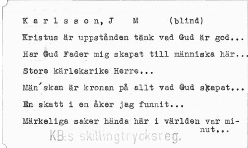 //// Karlsson,J M (blind) //// Kristus är uppstånden tänk vad Gud är god... Har Gud i'ader mig skapat till människa här.. Store kärleksrike Herre... //// Män'skan är kronan på allt vad Gud skapat... //// En skatt i en åker jag funnit... //// Märkeliga saker hända här i världen var mi- //// nut... //// KB:S skiliingtrycksreg, ////