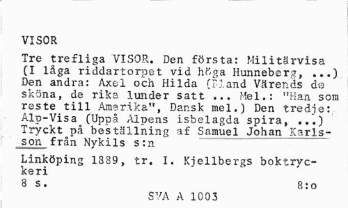 //// VISOR //// Tre trefliga VISOR. Den första: Militärvisa (I låga riddartorpet vid höga Hunneberg, ...) Den andra: Axel och Hilda (Fland Värends de sköna, de rika lunder satt ... Mel.: "Han som reste till Amerika", Dansk mel.) Den tredje: Alp-Visa (Uppå Alpens isbelagda spira, Tryckt på beställning af Samuel Johan Karlsson från Nykils s:n //// Linköping 1389, tr. I. Kjellbergs boktryckeri //// 8 s. 8:0 //// SVA A 1003 ////