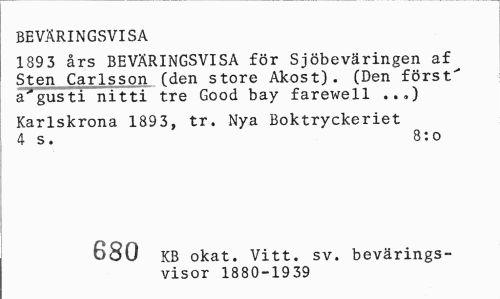 //// BEVÄRINGSVISA //// 1893 års BEVÄRINGSVISA för Sjöbeväringen af Sten Carlsson (den store Akost) . (Den först' augusti nitti tre Good bay farewell ..„) //// Karlskrona 1893, tr. Nya Boktryckeriet 4 s. 8:o //// khnc\ KB okat. Vitt. sv. bevärings- //// /0<£ visor 1880-1939 ////