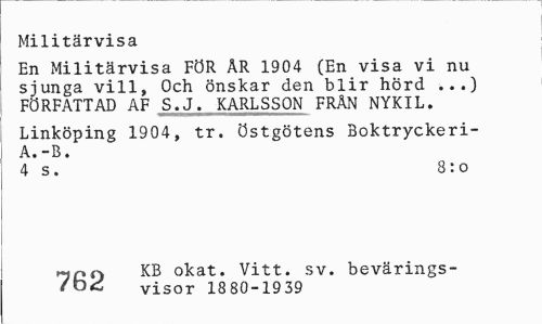 //// Militärvisa //// En Militärvisa FÖR ÅR 1904 (En visa vi nu sjunga vill, Och önskar den blir hörd ...) FÖRFATTAD AF S.J. KARLSSON FRÄN NYKIL. //// Linköping 1904, tr. östgötens Boktryckeri-A.-B. //// 4 s. 8: o //// khnc\ KB okat. Vitt. sv. bevärings- //// /0<£ visor 1880-1939 ////
