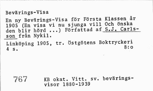 //// Bevärings-Visa //// En ny Bevärings-Visa för Första Klassen år 1905 (En visa vi nu sjunga vill Och önska den blir hörd ...) Författad af S.J. Carls-^ son från Nykil. //// Linköping 1905, tr. östgötens Boktryckeri 4 s. 8: o //// khnc\ KB okat. Vitt. sv. bevärings- //// /0<£ visor 1880-1939 ////