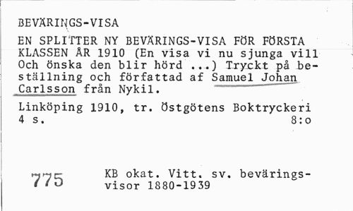 //// BEVÄRINGS-VISA //// EN SPLITTER NY BEVÄRINGS-VISA FÖR FÖRSTA KLASSEN ÄR 1910 (En visa vi nu sjunga vill Och önska den blir hörd ...) Tryckt på beställning och författad af Samuel Johan Carlsson från Nykil. //// Linköping 1910, tr. östgötens Boktryckeri 4 s. 8:o //// KB okat. Vitt. sv. bevärings- //// t 'O visor 1880-1939 ////