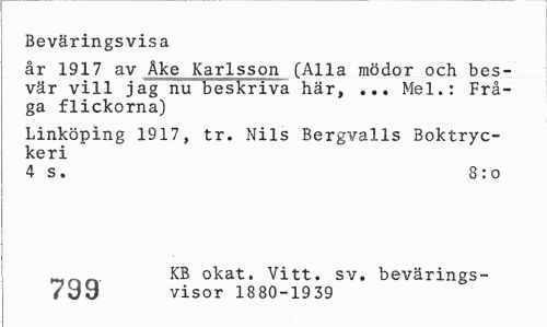 //// Beväringsvisa //// år 1917 av Åke Karlsson (Alla mödor och besvär vill jag nu beskriva här, ... Mel.: Fråga flickorna) //// Linköping 1917, tr. Nils Bergvalls Boktryckeri //// 4 s. 8 : o //// khnc\ KB okat. Vitt. sv. bevärings- //// /0<£ visor 1880-1939 ////