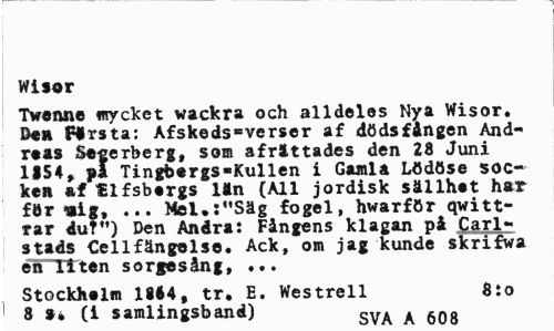 //// Wisor //// Twenne mycket vackra och alldeles Nya Wisor. Den Firsta: Afskeds«verser af dödsfången Andreas Socerberg, som afrättades den 28 Juni 1154, j»I Tingbergs-Kullen i Gamla Lödöse socken af 'Elfsborgs län (All jordisk sällhet har för »ig, ... Mel.:"Säg fogel, hwarför qwitt-rar duf") Den Andra: Fångens klagan på Carl-stads Cellfängelse. Ack, om jag kunde skrifwa en liten sorgesång, ... //// Stockholm 1844, tr. E. Westrell 8:o //// 8 s* (i samlingsband) cVa a fin» ////