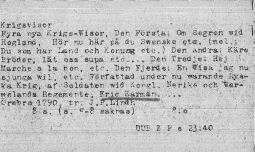//// - , ¦ ' //// Cxigsviaor . //// Pyra nya Krigs-tWiaor, Den Första. Oss S.egrfch m-ié I Hogl&nd , Hör ra* här. på du Sirenake' et«r»'' t««t Du a-o® har Land och Konung etö.) Den jindra: Käre-Bröder, lät oas supa etc..,» Den Tredje; Hej ',!arche a la bon, etc. Den Fjerde; En Wisa ,jag nu sjunga Wil, ftc. Författad under nu warajnde Kyska Krig» af Soldaten- wid Kpngl. Nerlke och 'ier- - //// Varda Regemente. ffrie Earman-. .y.. Crebro-1790 tr. J.P.UndK ¦ //// Ba. ( s, saknas} 0:o //// UUE Z P a 23140 ////