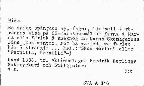 //// Wisa //// En spitt spångane ny, fager, ljufweli å rörannes Wisa på Sömmerhsmnsmål om Karna å Marna ella Kärlek å sneknog au Karna" Skomagarens Jins (Den winter, som ha warred, wa farlet . hår å strängj: ... Mel.:"Skön Serlin" eller "Pernilla, Pernilla"-) //// Lund 1888, tr. Aktiebolaget Fredrik Berlings Boktryckeri och Stilgjuteri //// | 4 s. *' 8:0 //// SVA A R46 ////