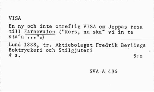 //// VISA //// En ny och inte otreflig VISA om Jeppas resa till Karnevalen ("Kors, nu ska" vi in te sta"*n „..".) //// Lund 1888, tr. Aktiebolaget Fredrik Berlings Boktryckeri och Stilgjuteri 4 s. 8:0 //// SVA A 4 35 ////