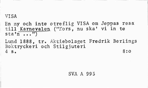 //// VISA //// En ny och inte otreflig VISA om Jeppas resa till Karnevalen ("Kors, nu ska' vi in te sta'n ...") //// Lund 1888, tr. Aktiebolaget Fredrik Berlings Boktryckeri och Stilgjuteri 4 s. 8:0 //// SVA A 99 5 ////