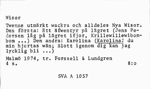 //// Wisor //// Twenne utmärkt wackra och alldeles Nya Wisor. Den första: Ett äfwentyr på lägret (Jens Pe-dersen låg på lägret ifjor, Krillewillewibom-bom ...) Den andra: Karolina (Karolina! du min hjertas wän; Blott igenom dig kan iag lycklig bli ...) //// Malmö 1974, tr. Forssell & Lundgren 4 s. 8:0 //// SVA A 10 57 ////