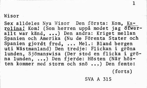 //// J. //// Wisor //// Sex alldeles Nya Wisor Den första: Kom, Karolina.' Kom.* (Som herren uppå modet jag öfwer-allt war känd, ...) Den andra: Kriget mellan Spanien och Amerika (Nu de Förenta Stater och Spanien gjordt fred, ... Mel.: Bland bergen uti Wästmanland) Den tredje: Flickan i gröna lunden, Sjömanswisa (Der stod en flicka i gröna lunden, ...) Den fjerde: Hösten (När hösten kommer med storm och snö ...) Den femte: //// (forts) //// SVA A 315 ////