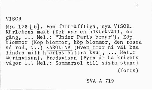 //// 1 //// VISOR //// N:o 138 [b]. Fem förträffliga, nya VISOR. Kärlekens makt (Det var en höstekväll, en gång, ... Mel.: "Under Paris broar"). Köp blommor (Köp blommor, köp blommor, den rosen så röd, ...) KAROLINA (Hvem tror ni väl kan lindra mitt hjärtas bittra kval, ... Mel.: Marinvisan). Fredsvisan (Fyra år ha krigets vågor ... Mel.: Sommarsol till sista stund) //// (forts) //// SVA A 719 ////