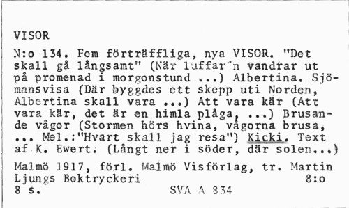 //// VISOR //// N:o 134. Fem förträffliga, nya VISOR. "Det skall gå långsamt" (När luffaren vandrar ut på promenad i morgonstund ...) Albertina. Sjömansvisa (Där byggdes ett skepp uti Norden, Albertina skall vara ...) Att vara kär (Att vara kär, det är en himla plåga, ...) Brusande vågor (Stormen hörs hvina, vågorna brusa* ... Mel.:"Hvart skall jag resa") Kicki. Text af K. Ewert. (Långt ner i söder, där solen..*) //// Malmö 1917, förl. Malmö Vis förlag, tr. Martin Ljungs Boktryckeri 8:0 //// 8 s. SVA A 3 34 ////
