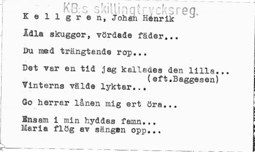 //// KS:s skillingtrycksreg, //// Kellgren, Johan Henrik //// Ädla skuggor, vördade fäder... //// Du med trängtande rop... //// Det var en tid jag kallades den lilla... //// (eft.Baggesen) //// Vinterns välde lyktar... //// - Go herrar lånen mig ert öra... //// Ensam i min hyddas famn... i Maria flög av sängen opp... //// L ////