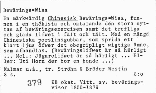 //// Bewärings=Wisa //// En raärkwärdig Chinesisk BewäringsaWisa. funnen i en thékista och omtalande den stora nyttan af bewäringsexercisen samt det trefliga och glada lifwet i fält och tält. Med en mängd Ghinesiska porslinsgubbar, som sprida ett klart ljus öfwer det obegripligt wigtiga ämne, som afhandlas. (Bewäringslifwet är så härligt ... Mel.: Jägarelifwet är så härligt ... Eller: Uti Horn der bor en bonde ...) //// Kalmar u.å., tr. Ströhm & Bröder Westin 8 s. 8:0 //// 379 KB okat. Vitt. sv. bevärings- //// visor 1800-18 79 ////