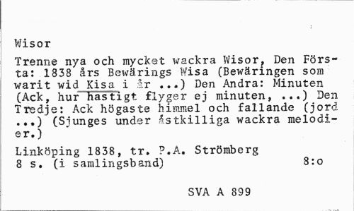 //// Wisor //// Trenne nya och mycket wackra Wisor, Den Första: 1838 års Bewärings Wisa (Bewäringen som warit wid Kisa i år ...) Den Andra: Minuten (Ack, hur hastigt flyger ej minuten, ...) Den Tredje: Ack högaste himmel och fallande (jord ...) (Sjunges under åstkilliga wackra melodier.) //// Linköping 1838, tr. P.A. Strömberg 8 s. (i samlingsband) 8:o //// SVA A 899 ////