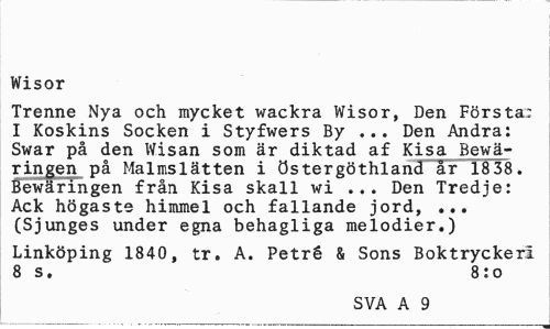 //// Wisor //// Trenne Nya och mycket wackra Wisor, Den Första: I Koskins Socken i Styfwers By ... Den Andra: Swar på den Wisan som är diktad af Kisa Bewäringen på Malmslätten i östergöthland år 1838. Bewäringen från Kisa skall wi ... Den Tredje: Ack högaste himmel och fallande jord, ... (Sjunges under egna behagliga melodier.) //// Linköping 1840, tr. A. Petré & Sons Boktryckeri 8 s. 8:o //// SVA A 9 ////