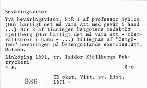 //// Beväringsvisor //// Två beväringsvisor. N:R 1 af professor Nyblom (Hur härligt det må vara Att med gevär i hand ...) N:r 2 af tidningen östgötens redaktör Kjellberg (Hur härligt det må vara att - röst-rättsbref i hand - ...) Tillegnas af "östgöten" beväringen på Östergötlands exercisslätt. Malmen. //// Linköping 1891, tr. Isidor Kjellbergs Boktryckeri //// 4 s. 8: o ___KB okat. Vitt. sv. hist. //// 986 i87i - ////