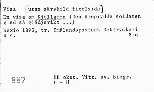 //// Visa | utan särskild titelsida^ //// En visa om Kiellgren ("Den äroprydde soldaten gled så glädjerikt ...) //// Wexiö 1895, tr. Smålandspostens Boktryckeri 4 s. 8:0 //// • __ y KB okat. Vitt. sv. biogr. ////