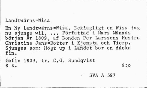 //// Land twärns =Wi s a //// En Ny Landtwärns=Wisa, Beklagligt en Wisa jag nu sjunga wil, „.. Författad i Mars Månads början Är 1809, af Bonden Per Larssons Hustru Christina Jans=Dotter i Kjemsta och Tierp. Sjunges som: Högt up i Landet bor en dåcka fin. //// Gefle 1809, tr. C.G. Sundqvist 8 s. 8:o //// SVA A 397 ////