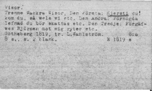 //// Visor." //// Trenne *ackrs Åisor, Den'borsta; Kj fr g t i du! kom du, så irl etc. Den Andra; ' *ornögda //// lefnad du" tör skattas etc. Den Tredje; Forgäf-tes Björnen mot mig ryter etc., aöthaborg 1H19, tr. L.Äahlstr&n. - ö:o //// 8 s., s. 2 V;länk. i l8lV s //// 1 - ... ¦ i ¦ ¦ //// v * v. "¦ ¦, V.'' \ //// V'--/¦¦¦M'"': //// v ' '„'.-'¦ - 'T t- <-'„ ? - ^ - v ¦• • - ////
