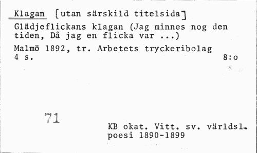 //// Klagan [utan särskild titelsida^] //// Glädjeflickans klagan (Jag minnes nog den tiden, Då jag en flicka var ...) //// Malmö 1892, tr. Arbetets tryckeribolag 4 s. 8:0 //// 71 //// KB okat. Vitt. sv. världsl» //// poesi 1890-1899 ////