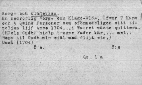 //// Sorg- och k 1 b v j sa,, //// En bedröflig sorg? och Klage-WlS*, Cfwer ? Man» och 5 Q,wine Personer som oföraodeligen sitt ti-ireliga lijf A,rn« 1704.,, i Watnet måste quittera. (HJelp Gudhl hielp trogne Fader kär,... mel.; Hops til Gudb-ro4n siaL ssed flijt etc.) Uooå (1704) //// 8 s. 5:o //// Qfi 1 a ////