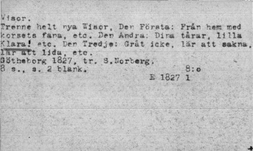 //// "'iscr. //// frenne helt rya. *iscr, Der Första: Från hem med icorsets fana, etc. Den Andra: Dina tårar, lilla ¦C la ra j etc. Den Tredje: Gråt icke, lär att sakna, lWTft lida, etc. 3ötheborg 1327, tr. 3.Borberg. B s., 3. 2 blank. 8:o //// E 1827 1 ////
