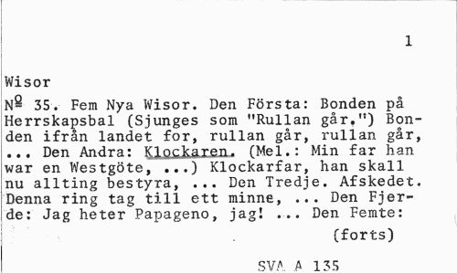 //// 1 //// Wisor //// N- 35. Fem Nya Wisor. Den Första: Bonden på Herrskapsbal (Sjunges som "Rullan går.") Bonden ifrån landet for, rullan går, rullan går, ... Den Andra: KlQ£.&ax£Ji. (Mel.: Min far han war en Westgöte, ...) Klockarfar, han skall nu allting bestyra, ... Den Tredje. Afskedet. Denna ring tag till ett minne, ... Den Fjer-de: Jag heter Papageno, jag! ... Den Femte: //// (forts) //// c:va a i ////