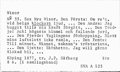 //// Wisor //// N§ 33. Sex Nya Wisor. Den Första: Om re!n, wid helga klockors ljud, ... Den Andra: Jag huggit tills min kraft förgått, ... Den Tredje: AckI högaste himmel och fallande jord, ... Den Fjerde: Ynglingens förhoppning» 31ott mina luftslott icke ramla, ... Den Femte: Till minnet. Minnet, saknan's tröstarinna, ... Den Sjette: Skönheten. Jag will gärna älskad bli, ... //// Köping 1877, tr. J.F. Säfberg 3:o //// 8 s. (i samlingsband) //// SVA A 5 23 ////