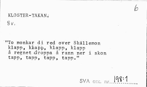 //// b //// KLOSTER-TAKAN. //// "To monkar di red over Skällemon klapp, klapp, klapp, klapp å regnet droppa å rann ner i skon tapp, tapp, tapp, tapp." //// SVA ccc. nr.. JW.1... ////