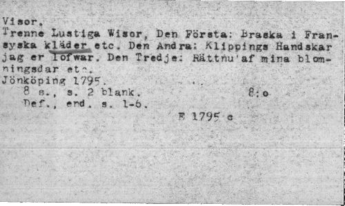 //// Visor. //// Trenne Lustiga Wisor, Den Första: Braska i Fransyska kläd sr. etc. Den Andra: Klippings Handskar jag er Tofwar. Den Tredje: Hättnu'af mina bl om-ni ngsd ar et". //// Jönköping 1795. . . //// 8 b., s. 2 blank. 8:o //// Def., end . s. l-ö. //// * 1795 « ////