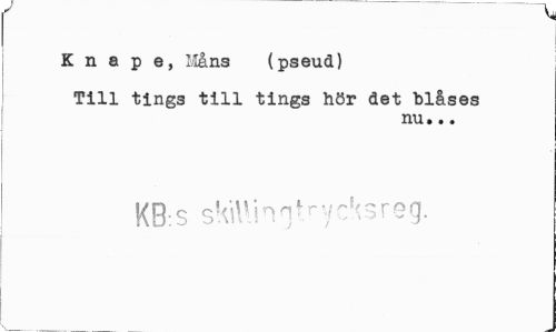 //// v //// K n a p e, Måna (pseud) //// Till tings till tings hör det blåses //// nu... //// KB:S skillm^-rycksreg. ////
