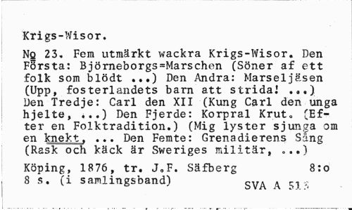 //// Krigs-Wisor. //// Nfi 23. Fem utmärkt wackra Krigs-Wisor. Den Första: Björneborgs=Marschen (Söner af ett folk som blödt ...) Den Andra: Marseljäsen (Upp, fosterlandets barn att strida! Den Tredje: Carl den XII (Kung Carl den unga hjelte, ,..) Den Fjerde: Korpral Krut* (Efter en Folktradition.) (Mig lyster sjunga om en knekt. ... Den Femte: Grenadierens Sång (Rask och käck är Sweriges militär, ...) //// Köping, 1876 , tr. J0F. Säfberg 8:0 //// 8 s. (i samlingsband) SVA ^ ^- ////