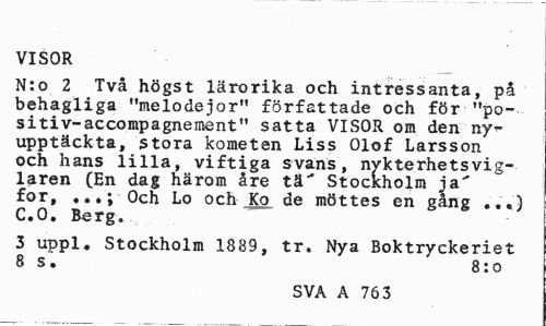 //// VISOR //// N:o 2 Två högst lärorika och intressanta, på behagliga "melodejor" författade och för "positiv- accompagnement" satta VISOR om den nyupptäckta, stora kometen Liss Olof Larsson och hans lilla, viftiga svans, nykterhetsvig-laren (En dag härom åre tä" Stockholm ja" for, Och Lo och JCo. de möttes en gång ..,) //// C.O. Berg. //// 3 uppl• Stockholm 1889, tr. Nya Boktryckeriet //// 8 s. 8: o //// SVA A 763 ////