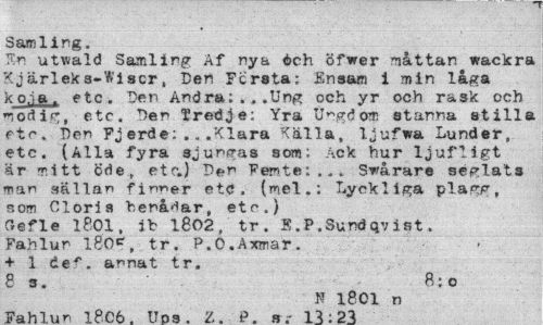 //// Samling. //// Kn utvald Samling Af nya öch öfwer måttan wackra Kjärleks-Wiscr, Den Fcrsta; Ensam i min låga k o.i a. etc. Den Andra; .. .Ung och yr och rask och "nödig, etc. Den tredje: Yra Ungdom stanna stilla ftc. De^ Fjerde:...Klara Källa, ljufwa Lund er, etc. (Alla fyra sjungas som: Ack hur ljufligt är ritt Öde, etc.) Den Femte:,.. Svårare seglats man sällan finner etc. (mel.; Lyckliga plagg, som Cloris benådar, etc.) Oefle 1801, ib 1802, tr. S.P.Sundqvist. Fahlun l80e, tr. P.O.Axmar. + 1 de^. annat tr. //// 83. 8:0 //// N 1801 n //// Vah T un 7 PfiA TTnn 7. f> n1 } : 93 ////