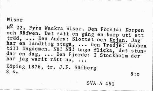 //// Wisor //// N§ 22. Fyra Wackra Wisor. Den Första: Korpen och Räfwen. Det satt en gång en korp uti ett träd, ... Den Andra: Slottet och Kojan. Jag har en landtlig stuga, ... Den Tredje: Gubben till Ungdomen. Nå! Nå! unga flicka, det stundar en dag, ... Den Fjerde: I Stockholm der har jag warit rätt nu, ... //// Köping 1876, tr. J.F. Säfberg //// 8 s. 8:o //// SVA A 451 ////