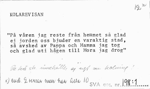 //// a5^ //// KOLAREVISAN //// "På våren iag reste från hemmet så glad ej jorden oss bjuder en varaktig stad, så avsked av Pappa och Mamma jag tog och glad uti hågen till Mora jag drog" //// <) VM^s -i HMbh Vmmj -hw fatij 10 . i OiV\A //// SVA . nrJJA..!... ////